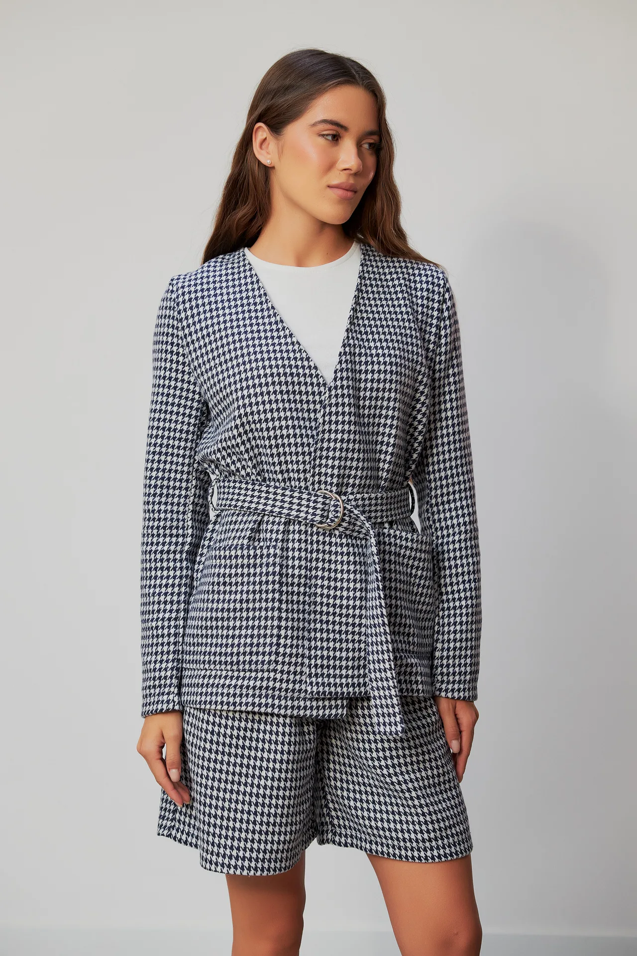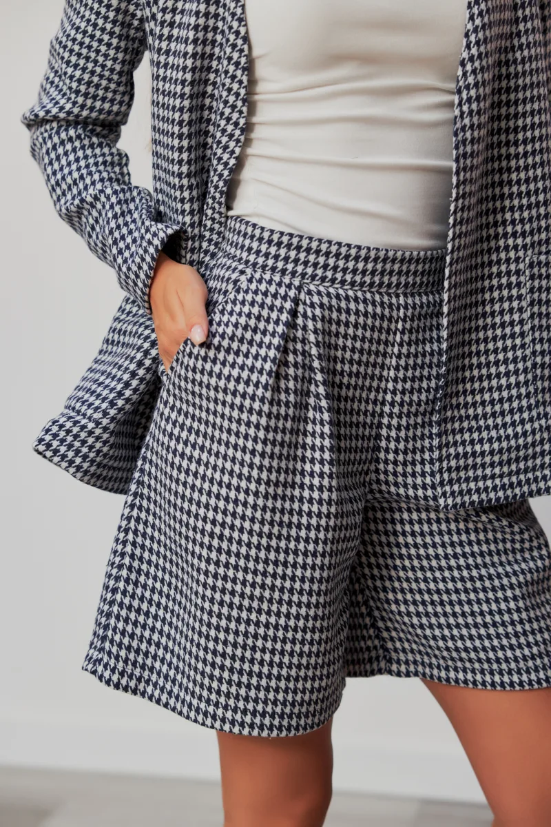 Принт: стильний гусяча лапка, класичний візерунок, що додає костюму сучасного вигляду та неповторного шарму.