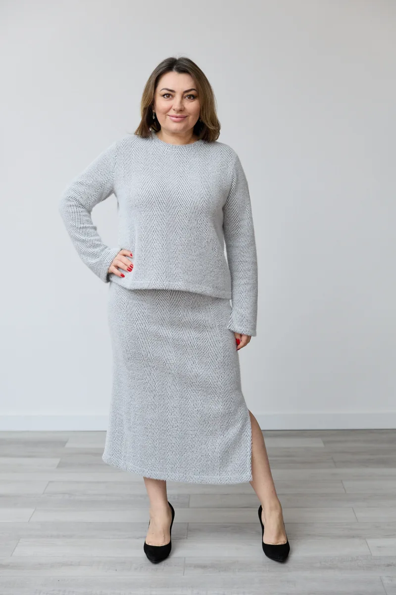 Дизайн: костюм складається з олівцевої спідниці та кофти, що підкреслює фігуру та додає образу елегантності.