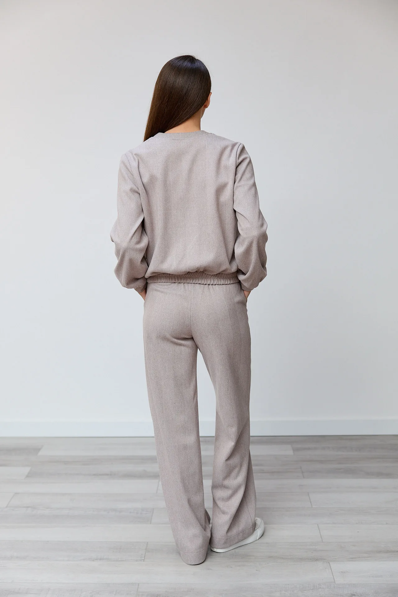 Штани вільного крою, довгі, розширені від стегон, кишені з відрізним бочком. По передніх половинках застрочені стрілки. Потайна застібка у бічному шві. Верхній зріз оброблений поясом з еластичною тасьмою ззаду.