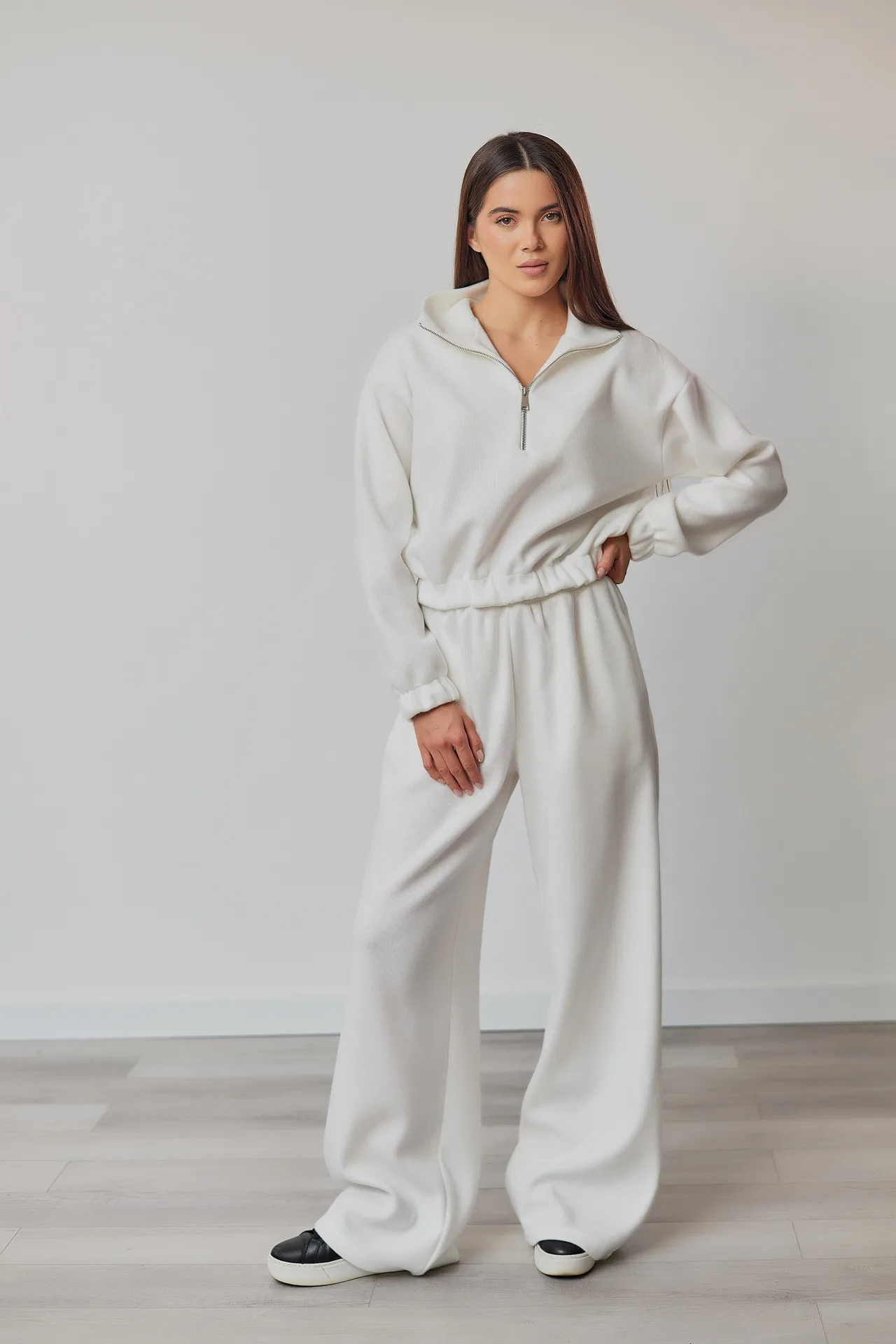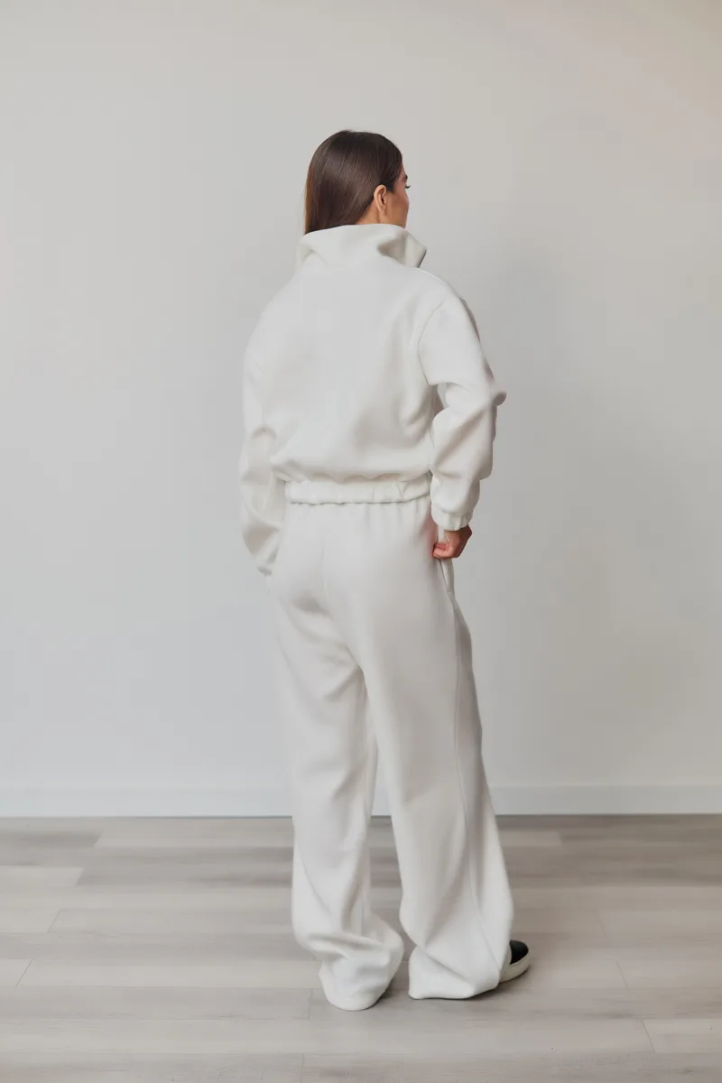 Дизайн: коротке худі і штани з високою посадкою, що підкреслюють талію і створюють елегантний силует.