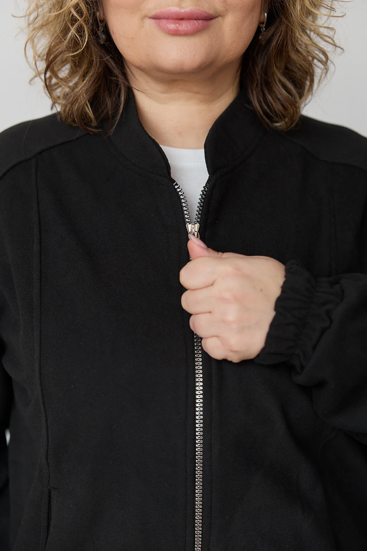 Бомбер вільного силуету, з довгим рукавом, на пілочках фігурні рельєфи у яких розташовані кишені, застібка центральна та оздоблюючу тасьму блискавку, горловина оброблена стійкою. Низ виробу та низ рукава – манжети на еластичній тасьмі.