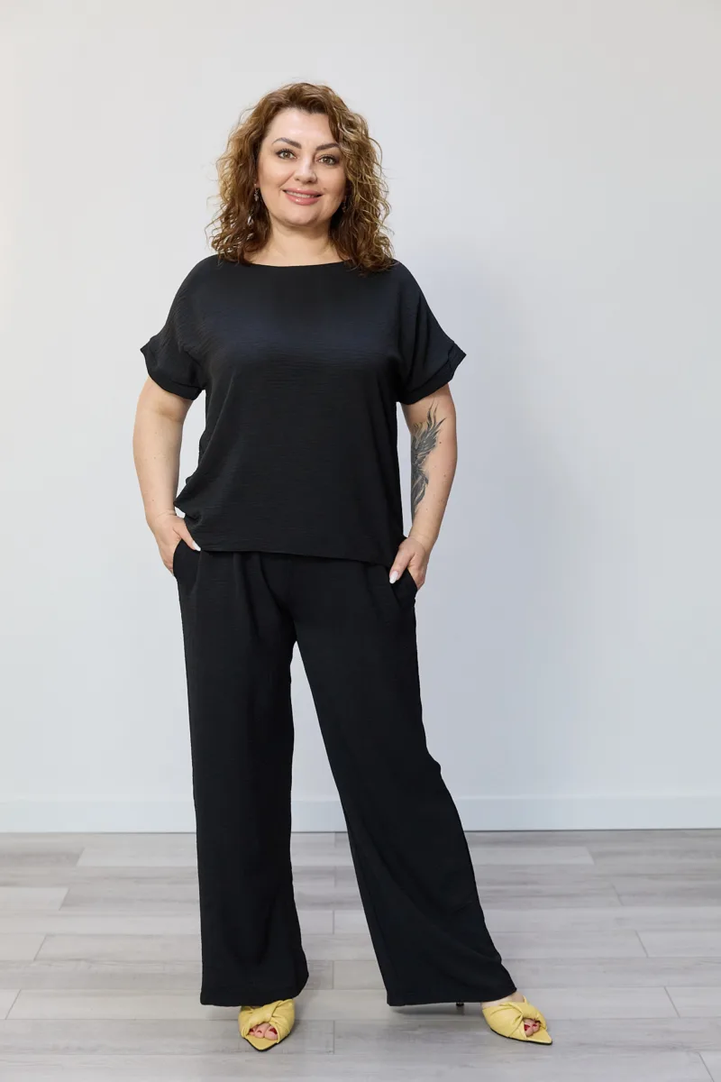 Костюм ESTILO жіночий із вільною блузою та широкими штанами. Стильний та комфортний костюм у трендовому відтінку- ідеальний вибір для повсякденних образів, роботи або відпочинку. Комплект складається з вільної блузи з коротким рукавом та широких штанів прямого крою. Блуза має лаконічний круглий виріз. Зручні кишені додають практичності та сучасного вигляду. Штани вільного силуету красиво струмують по фігурі, забезпечуючи комфорт протягом усього дня. Модель вдало поєднує жіночність і свободу рухів, легко комбінується як із взуттям на підборах, так і з кедами чи сандалями.