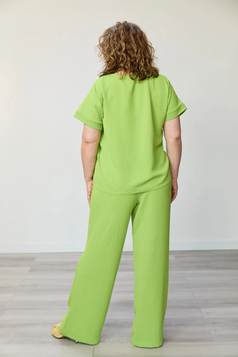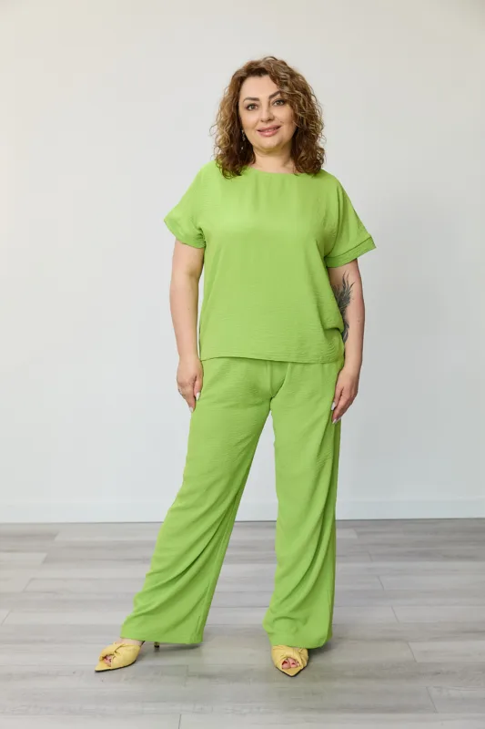 Костюм ESTILO жіночий із вільною блузою та широкими штанами. Стильний та комфортний костюм у трендовому відтінку- ідеальний вибір для повсякденних образів, роботи або відпочинку. Комплект складається з вільної блузи з коротким рукавом та широких штанів прямого крою. Блуза має лаконічний круглий виріз. Зручні кишені додають практичності та сучасного вигляду. Штани вільного силуету красиво струмують по фігурі, забезпечуючи комфорт протягом усього дня. Модель вдало поєднує жіночність і свободу рухів, легко комбінується як із взуттям на підборах, так і з кедами чи сандалями.