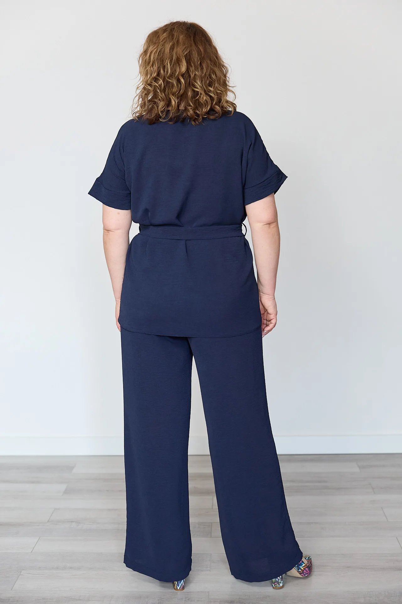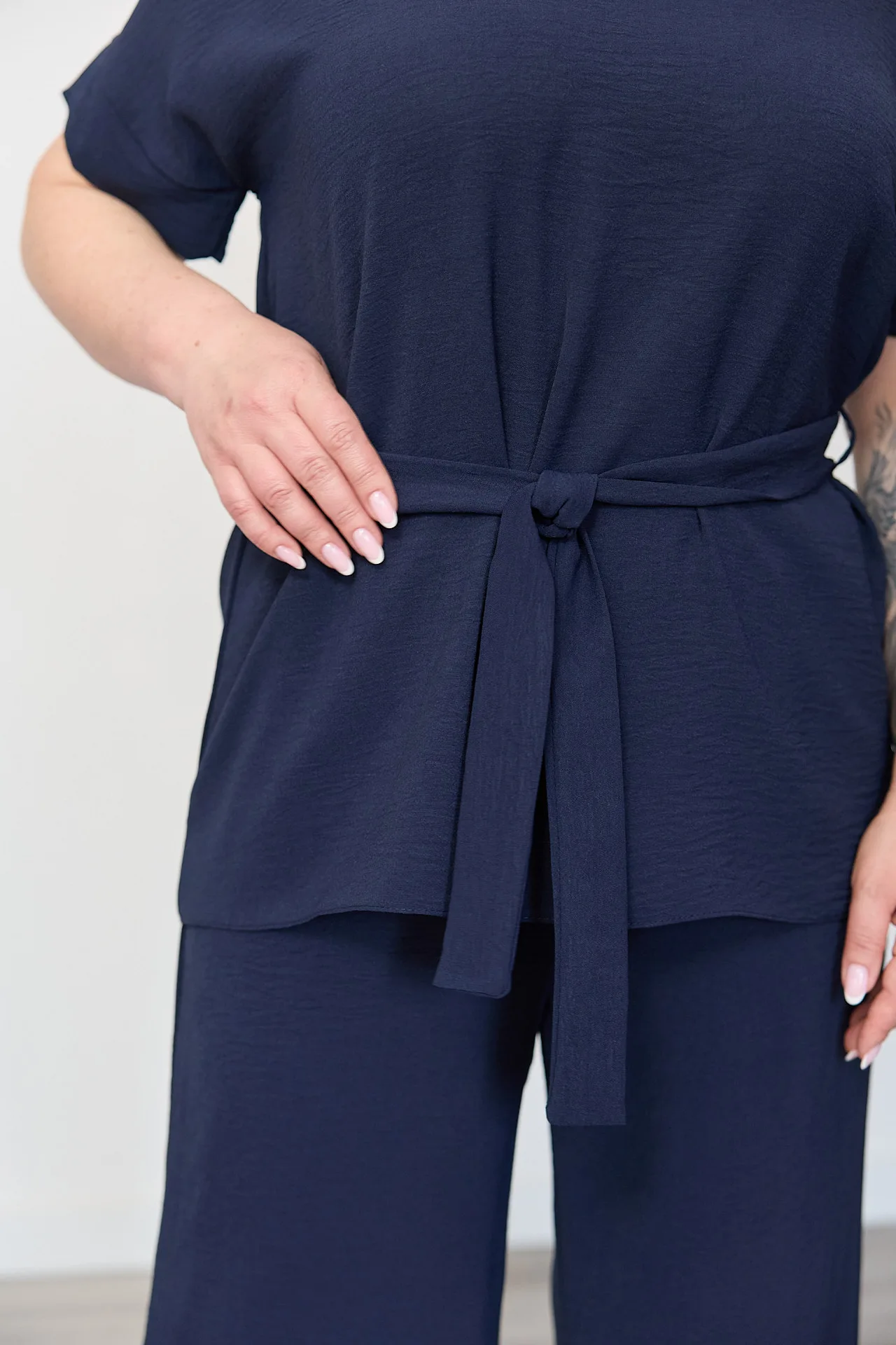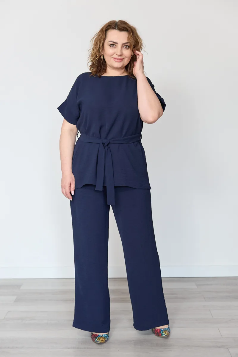 Костюм ESTILO жіночий із вільною блузою та широкими штанами. Стильний та комфортний костюм у трендовому відтінку- ідеальний вибір для повсякденних образів, роботи або відпочинку. Комплект складається з вільної блузи з коротким рукавом та широких штанів прямого крою. Блуза має лаконічний круглий виріз та доповнена знімним поясом, який підкреслює талію та дозволяє регулювати посадку. Зручні кишені додають практичності та сучасного вигляду. Штани вільного силуету красиво струмують по фігурі, забезпечуючи комфорт протягом усього дня. Модель вдало поєднує жіночність і свободу рухів, легко комбінується як із взуттям на підборах, так і з кедами чи сандалями.