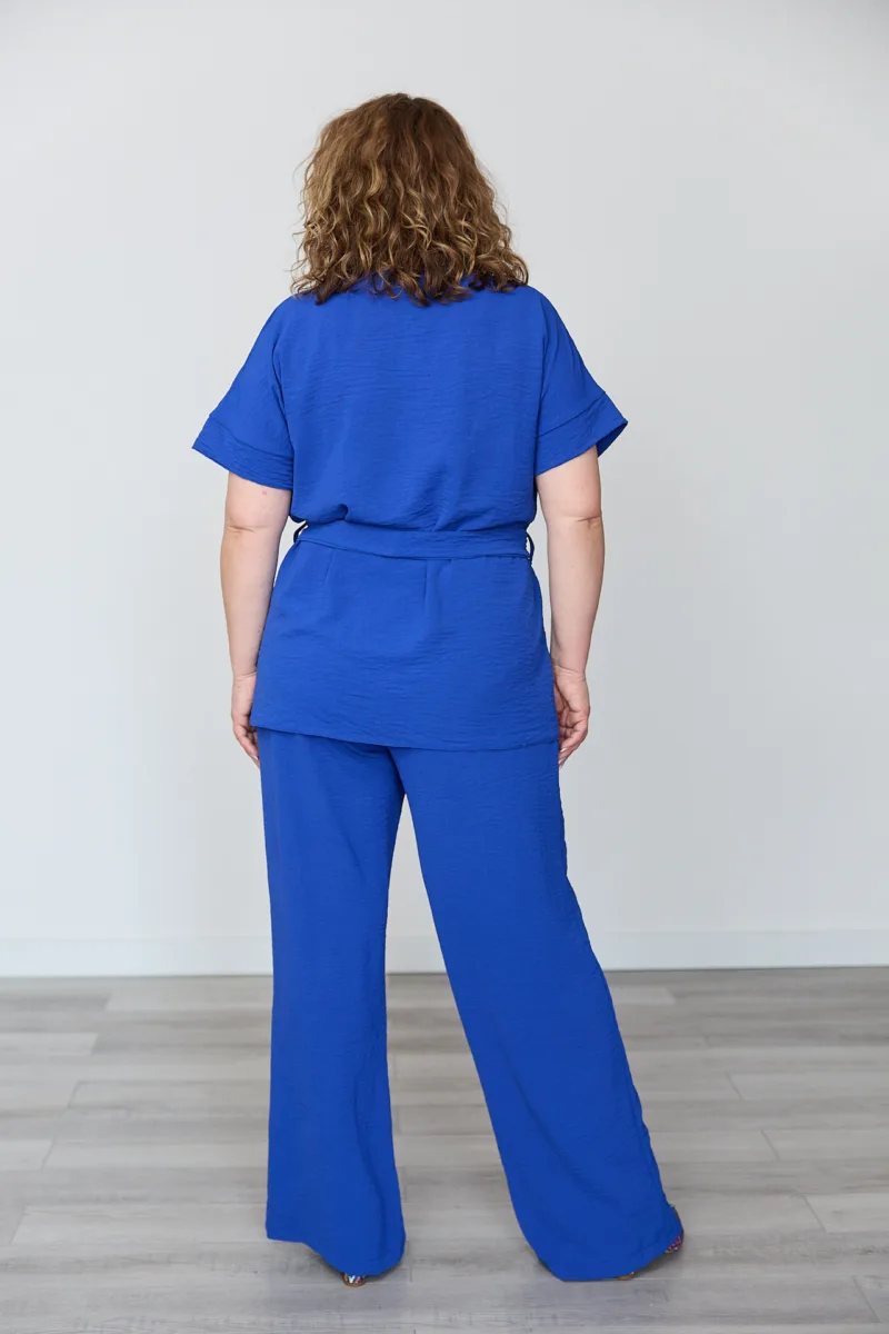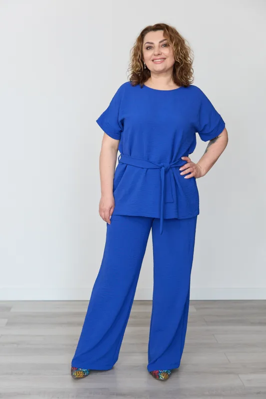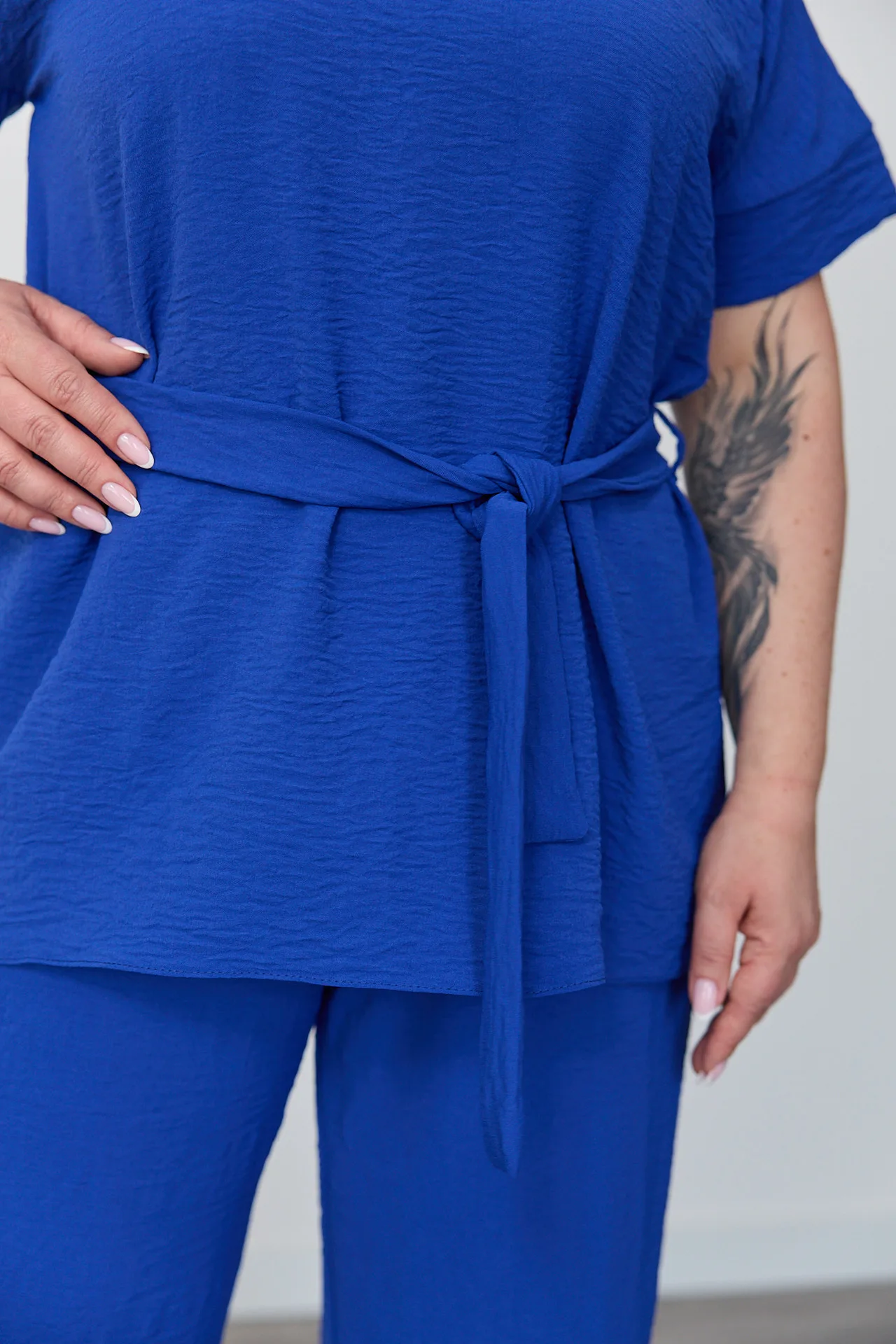 Костюм ESTILO жіночий із вільною блузою та широкими штанами. Стильний та комфортний костюм у трендовому відтінку- ідеальний вибір для повсякденних образів, роботи або відпочинку. Комплект складається з вільної блузи з коротким рукавом та широких штанів прямого крою. Блуза має лаконічний круглий виріз та доповнена знімним поясом, який підкреслює талію та дозволяє регулювати посадку. Зручні кишені додають практичності та сучасного вигляду. Штани вільного силуету красиво струмують по фігурі, забезпечуючи комфорт протягом усього дня. Модель вдало поєднує жіночність і свободу рухів, легко комбінується як із взуттям на підборах, так і з кедами чи сандалями.
