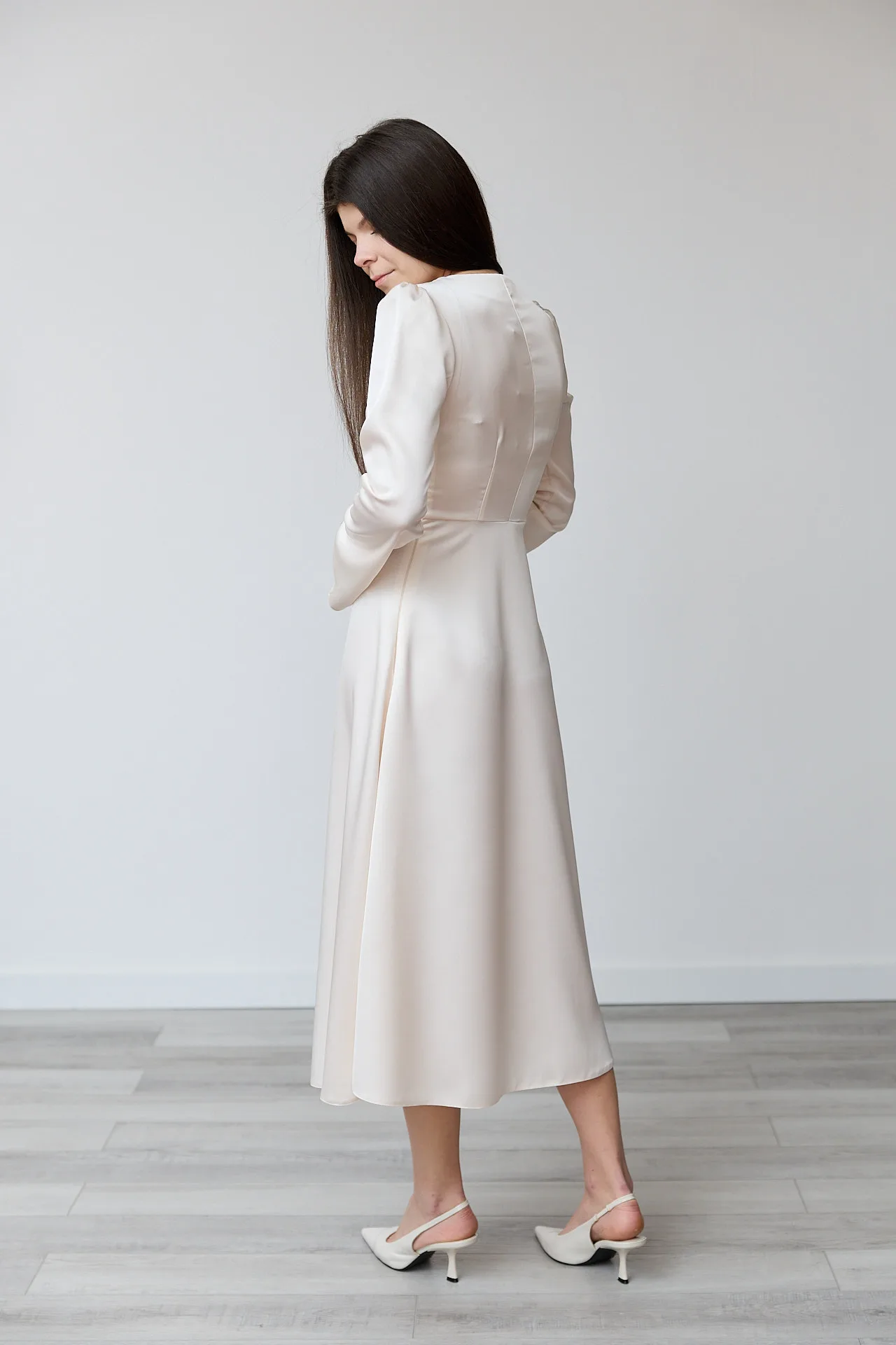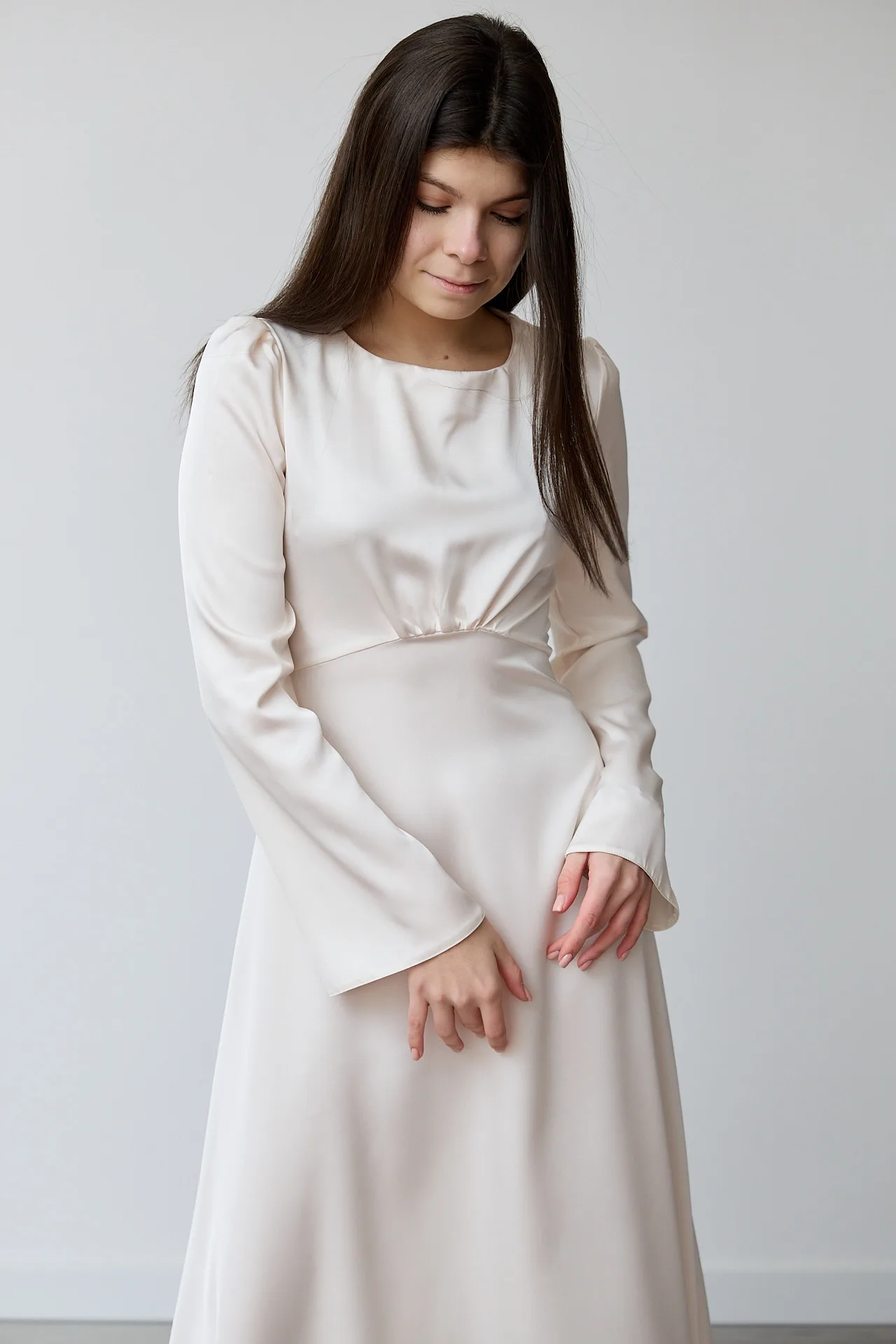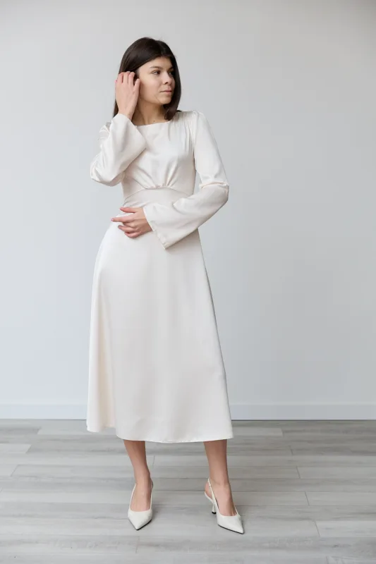 Круглий виріз горловини додає стриманості, а довгі рукави злегка розширеного крою надають образу вишуканості. Легка, приємна до тіла тканина, шовк ( шовк 50%, поліестер 20%, еластан 20%) перлинного кольору, м’яко струмує та забезпечує комфорт протягом усього дня. Спідниця А-силуету красиво рухається під час ходьби, підкреслюючи елегантність моделі.