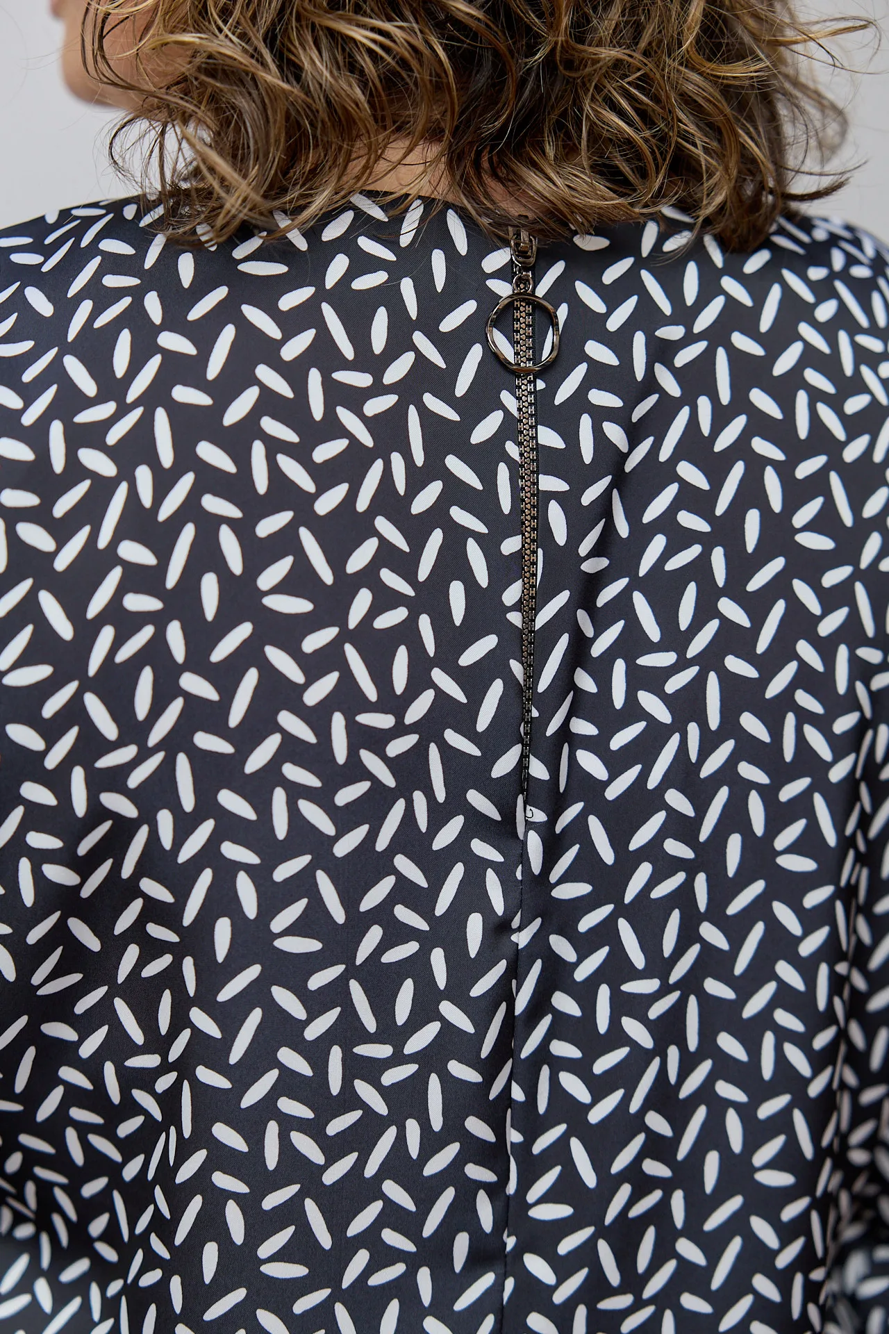На спинці розташована декоративна блискавка з елегантним кільцем-підвіскою, що додає виробу оригінальності та зручності при одяганні.
