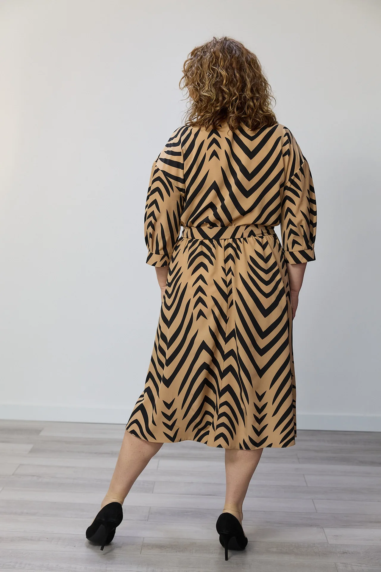 Сукня оснащена класичним комірцем та потайною застібкою на ґудзики спереду, що додає їй стриманої елегантності. Рукави довжиною 3/4 забезпечують практичність і універсальність у носінні. Легка тканина приємна до тіла та гарно драпірується, створюючи жіночний, витончений вигляд.